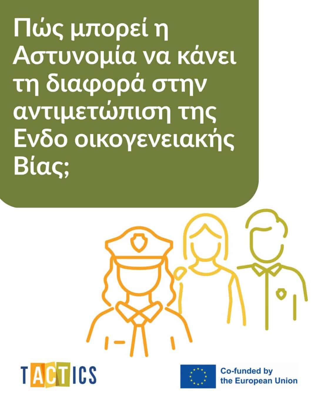 Το έργο TACTICS ολοκληρώνεται, όμως η προσπάθεια για την πρόληψη της Ενδοοικογενειακής Βίας έχει ακόμα πολύ δρόμο μπροστά της. Τα προηγούμενα χρόνια, στο πλαίσιο υλοποίησης του έργου TACTICS εργαστήκαμε εντατικά ώστε να δυναμώσουμε το ρόλο της Αστυνομίας στην αντιμετώπιση και ανταπόκριση στο φαινόμενο.