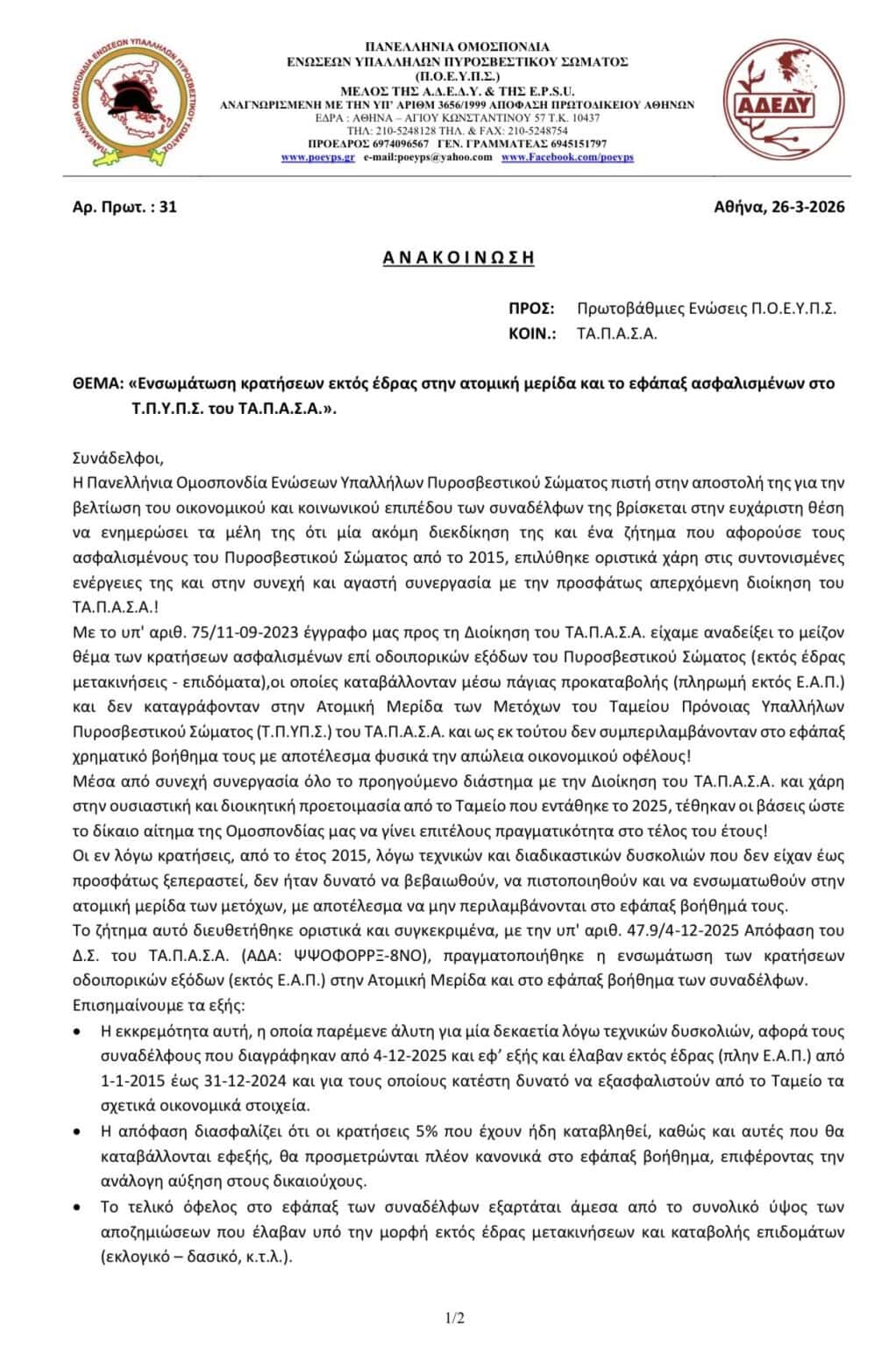 Σώματα Ασφαλείας Πυροσβεστική Ενσωμάτωση κρατήσεων εκτός έδρας στην ατομική μερίδα και το εφάπαξ ασφαλισμένων στο... Σώματα ΑσφαλείαςΠυροσβεστική Ενσωμάτωση κρατήσεων εκτός έδρας στην ατομική μερίδα και το εφάπαξ ασφαλισμένων στο Τ.Π.Υ.Π.Σ. του ΤΑ.Π.Α.Σ.Α. 14/04/2026 FacebookTwitterWhatsAppEmailΤυπώνωTelegramViber ΣΤΗΝ ΙΔΙΑ ΚΑΤΗΓΟΡΙΑΠΕΡΙΣΣΟΤΕΡΑ... Πυροσβεστική Πρόγραμμα Διασυνοριακής Συνεργασίας «Ελλάδα – Βουλγαρία, 2021-2027» – “Floodguard 2” Πυροσβεστική Πρόγραμμα προκαταρκτικών εξετάσεων για την εισαγωγή σπουδαστών/ριών στη Σχολή Αξιωματικών και στη Σχολή Πυροσβεστών της Πυροσβεστικής Ακαδημίας Πυροσβεστική Δωρεά υλικού Εικονικής Πραγματικότητας από την εταιρία Digital Tribes στο Πυροσβεστικό Σώμα ΔΙΑΒΑΣΤΕ ΕΠΙΣΗΣ ΟΠΚΕ Κορινθίας: Σύλληψη άνδρα που είχε αεροβόλο πιστόλι, μαχαίρι, αναδιπλούμενο σουγιά... 18/04/2026 Ερντογάν: «Απορρίπτουμε μονομερείς ενέργειες σε Αιγαίο και αν.Μεσόγειο που επιδιώκουν να... 18/04/2026 Τέσσερις φορές ισόβια και επιπλέον κάθειρξη στον πρώην αστυνομικό της Βουλής... 18/04/2026 Τέσσερις συλλήψεις από τους ελέγχους στο πλαίσιο διεξαγωγής αγώνα ποδοσφαίρου το... 18/04/2026 Ο Frontex για τον αριθμό των παράτυπων διελεύσεων των συνόρων της... 18/04/2026 Συμμορία έκλεβε μοτοσυκλέτες και στη συνέχεια τις αποσυναρμολογούσε και πουλούσε τα... 18/04/2026 ΣΞ: Τέλος οι μεταθέσεις ΑΣΣΥ – ΕΜΘ – ΕΠΟΠ 18/04/2026 Κοινό Εκπαιδευτικό Πρόγραμμα Σχολών Πολέμου των κρατών-μελών της Ευρωπαϊκής Ένωσης 18/04/2026 Δαβάκης: Για αυτό το λόγο ΔΕΝ χορηγήθηκε το Πάσχα Έκτακτο Μέρισμα... 18/04/2026 Aπάτη για υποτιθέμενη είσπραξη χρημάτων – Συμβουλές από Τράπεζα 18/04/2026