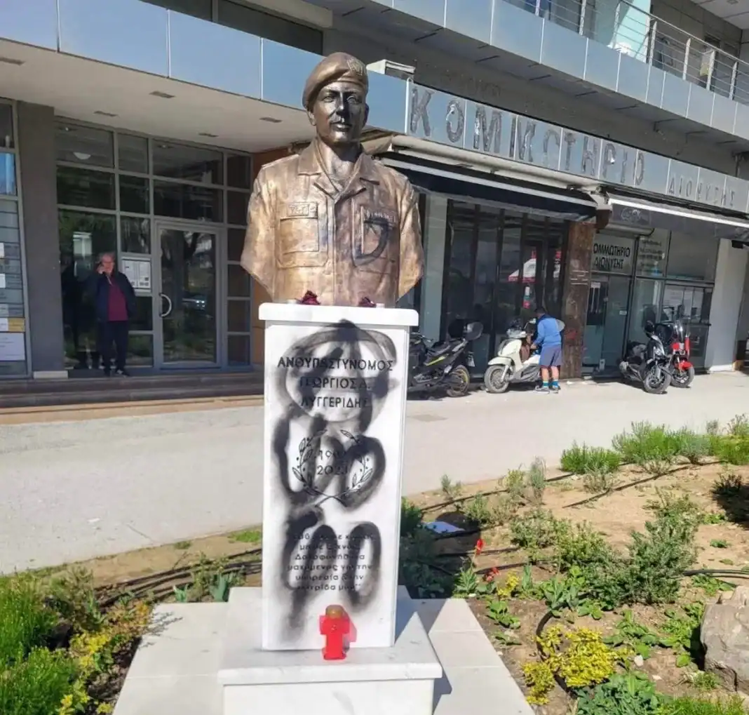 Οι δράστες μουτζούρωσαν τη βάση στην οποία έχει τοποθετηθεί η προτομή του αστυνομικού που έχασε τη ζωή του μετά τη δολοφονική επίθεση που δέχθηκε στου Ρέντη.